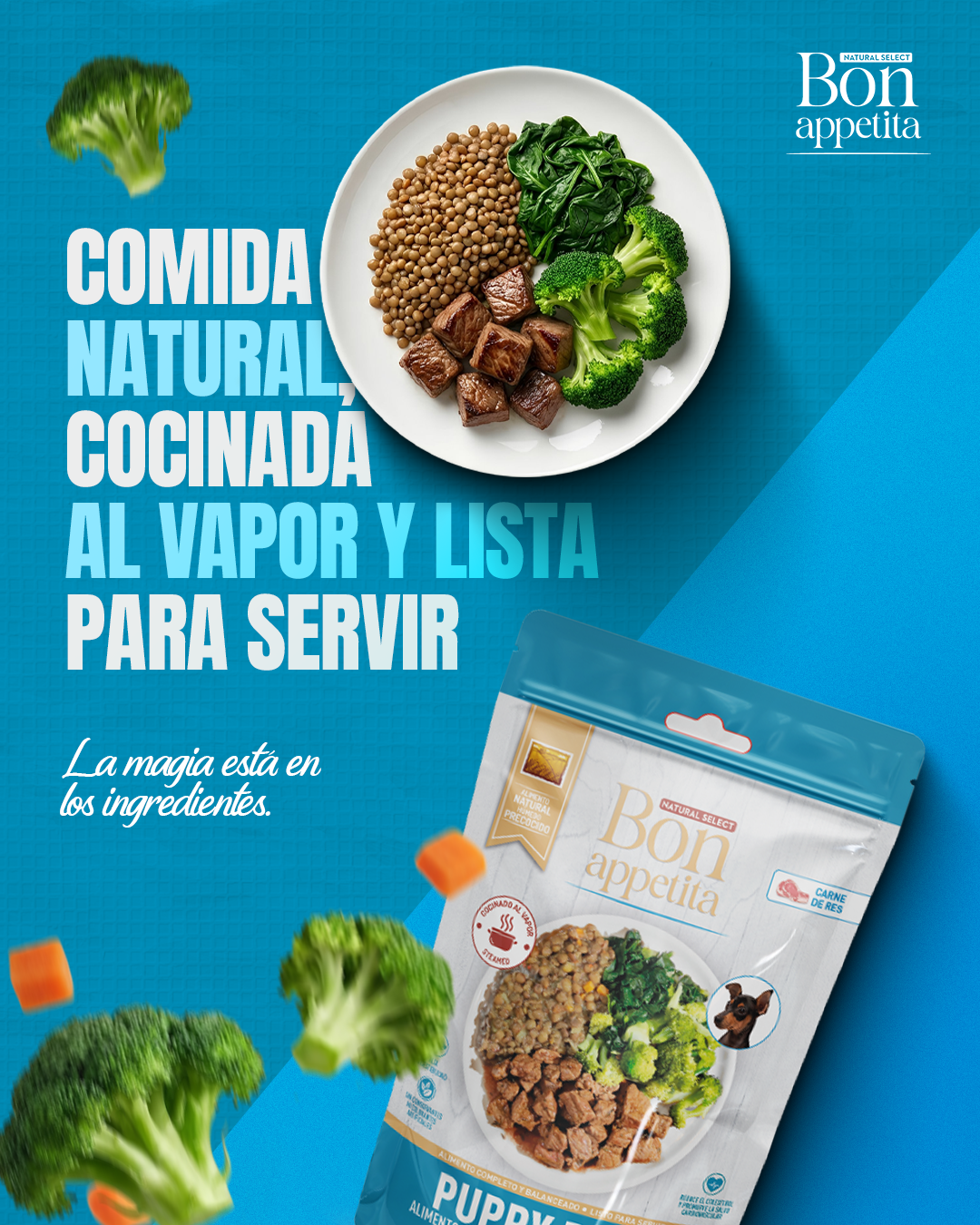 El alimento cocinado al vapor BON APPETITA provee los nutrientes necesarios para que tu consentido esté sano, feliz y vital; en este sentido, es necesario que además del agua, los nutrientes se consuman diariamente en las cantidad y balance óptimos para que cumplan las funciones vitales en la vida de tu mascota. Dichos nutrientes están compuestos por proteínas, grasas, carbohidratos, vitaminas y minerales, y se encuentran inmersos en los ingredientes que usamos para fabricar nuestras fórmulas, tales como; carne magra de pollo, res, cordero, cerdo o pavo, lentejas, avena, brócoli, zanahorias, apio hervido, cúrcuma, y vitaminas y minerales.
