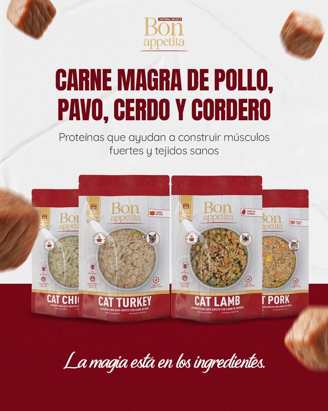 Las fórmulas especializadas de Bon Appetita contienen un balance perfecto de nutrientes para alimentar a perros y gatos cachorros y adultos, con fuentes de proteína animal, tales como; carne, pollo, cerdo y cordero para perros, y pollo, cerdo, cordero y pavo para gatos.