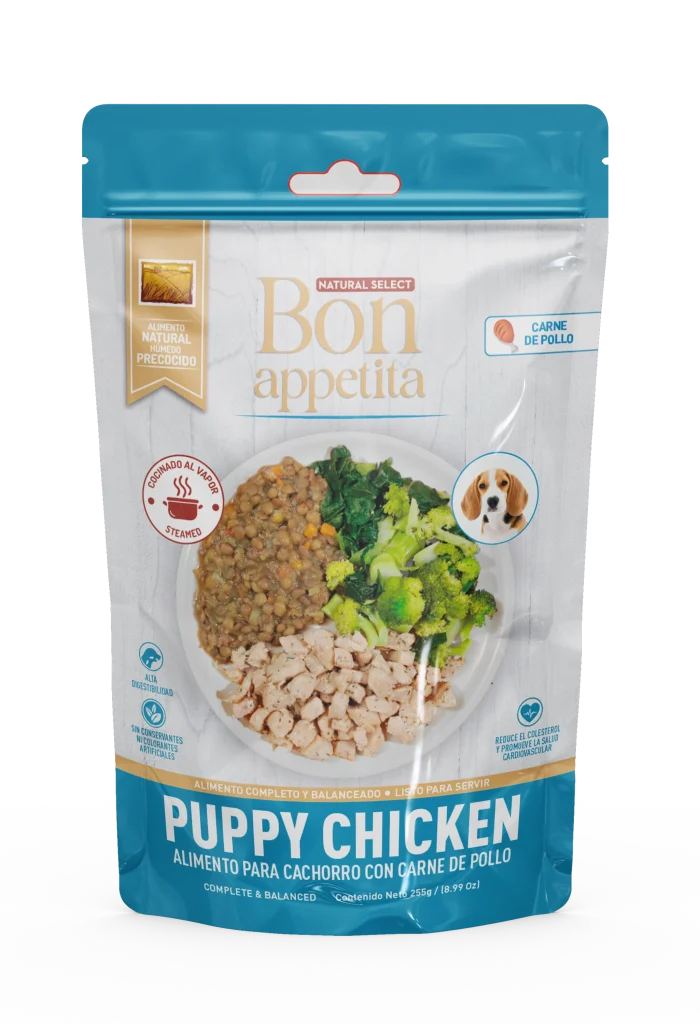 Suministrar 40g de BON APPETITA DOG PUPPY CHICKEN por cada kilogramo de peso de tu perro, dividido en 2 raciones al día.